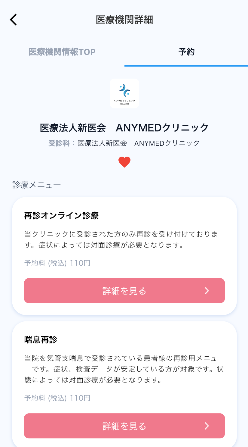 選択した医療機関の詳細が表示されますので、予約したい診療メニューの「詳細を見る」をタップして診療予約を進めてください。